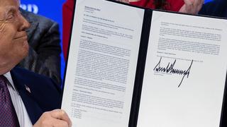U.S. President Donald Trump holds a signed resolution, as he attends a charter announcement for his Board of Peace initiative aimed at resolving global conflicts, alongside the 56th annual World Economic Forum (WEF), in Davos, Switzerland on January 22, 2026.