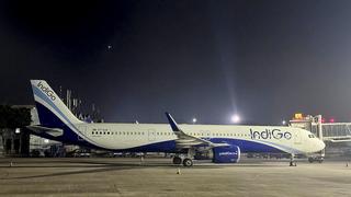 An IndiGo passenger flight at Swami Vivekananda Airport in Raipur, Chhattisgarh, late on December 4, 2025.